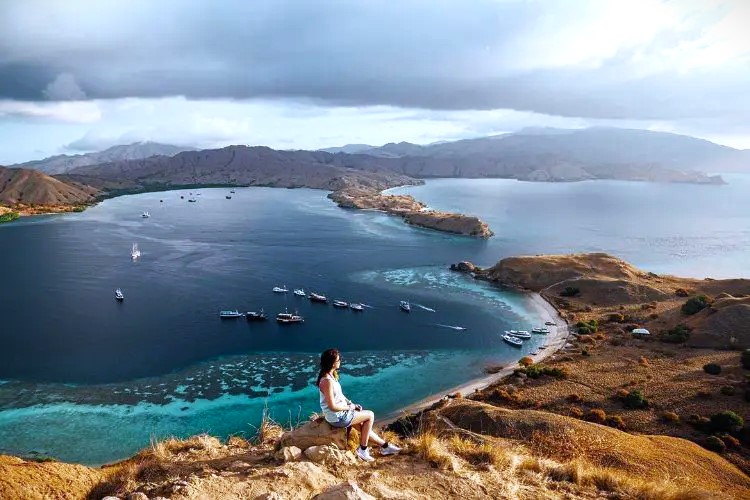 Sesampainya di puncak, rasa letih seketika terbayar dengan panorama yang menakjubkan. Bukit-bukit eksotis, hamparan rumput keemasan saat kemarau, serta gradasi biru laut dan langit berpadu menciptakan lanskap memukau.