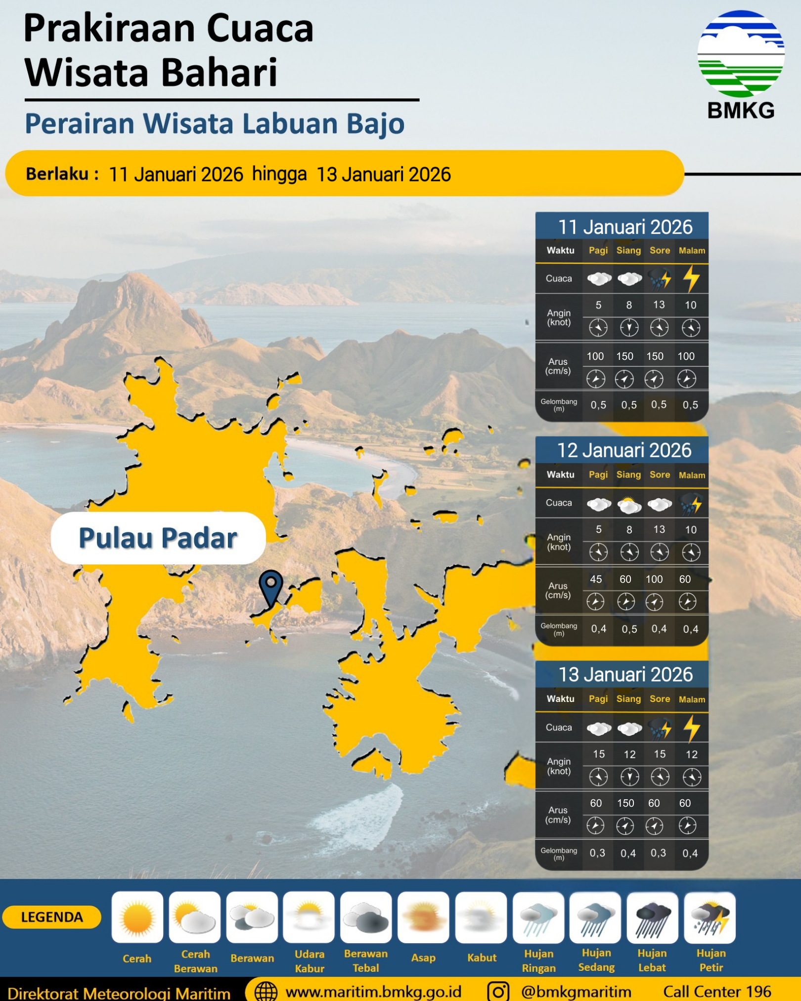 LABUAN BAJO,– Badan Meteorologi, Klimatologi, dan Geofisika (BMKG) Direktorat Meteorologi Maritim merilis prakiraan cuaca maritim terperinci untuk kawasan wisata bahari Labuan Bajo, mencakup perairan sekitar Pulau Rinca, Papagarang, Sabolo, dan Padar, yang berlaku mulai 11 hingga 13 Januari 2026.