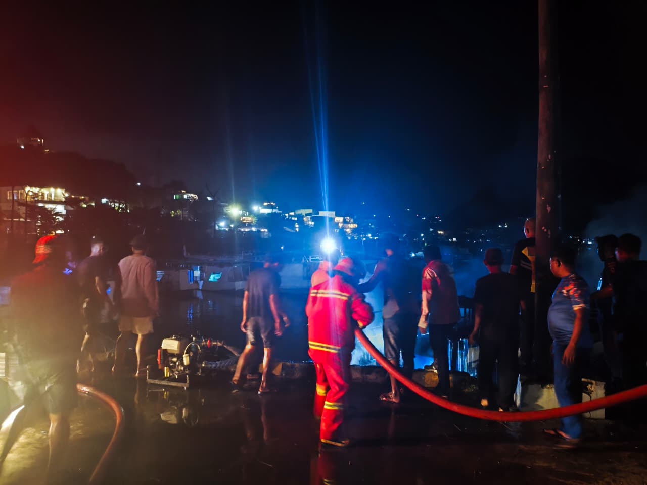 Petugas langsung berkoordinasi dengan tim tanggap darurat dan bergegas ke lokasi kejadian dengan membawa alat pemadam api ringan, pompa alkon, dan mobil tangki air. Bantuan juga datang dari kapal KN.P Grantin, KP. Ibis, dan mobil pemadam kebakaran dari Satpol PP.